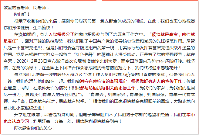 收到曹老师、闵老师的特别“家书”,丹青第一党支部的同学们也纷纷回信。