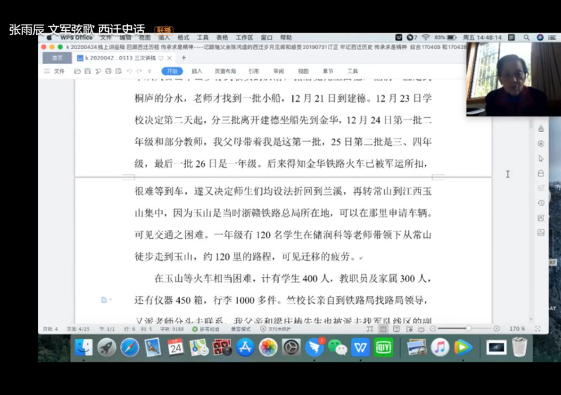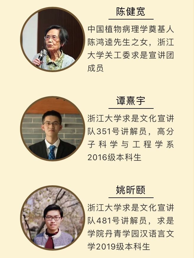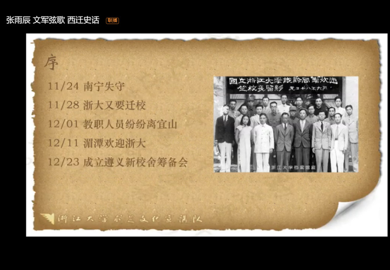 文军弦歌,西迁史话——浙江大学第三届校史文化节·西迁主题校史讲座顺利举行。本次讲座采取线上钉钉群直播的方式,邀请了三位嘉宾分享与浙大西迁相关的点点滴滴。他们分别是浙大关工委陈健宽老师,求是文化宣讲队351号讲解员谭熹宇以及481号讲解员姚昕颐。