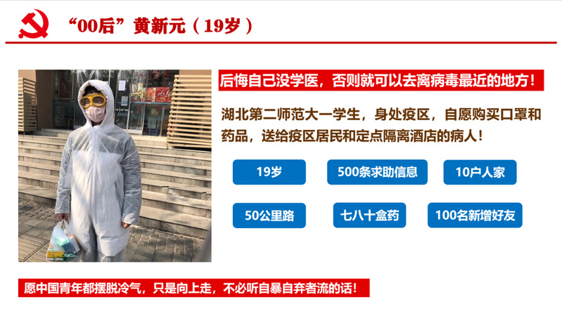 “00后”护士的无悔逆行、湖北中医药大学生走向街头、武汉大学生自我隔离38天,通过三个“00后”在疫情之中表现活跃的新闻,我们发现他们与似乎初印象有些不同,“00后”挺身而出,义无反顾地成为了抗疫的英雄。