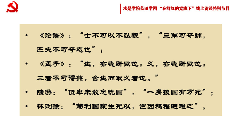 为了让“00后”的同学们重新认识自我、勇担时代责任,2020年3月27日晚,求是学院蓝田学园通过钉钉直播的方式举办了“在鲜红的党旗下”访谈特别节目,这是一场广泛参与、别样生动的线上党课。