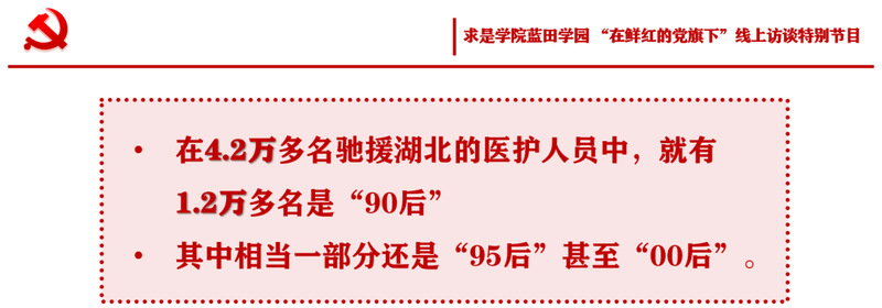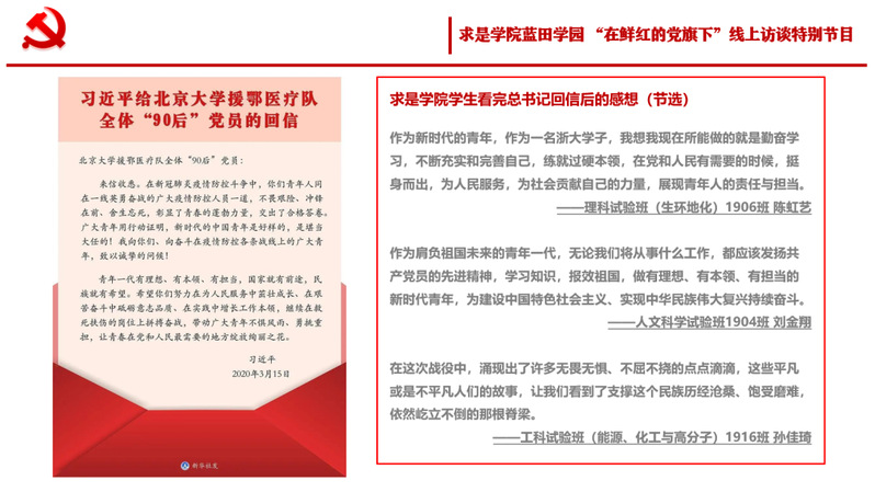主持人徐意棋老师展示了习近平总书记勉励北京大学援鄂医疗队全体“90后”党员的回信,回信内容体现了时代对“00后”新生代主角们的殷切期待。