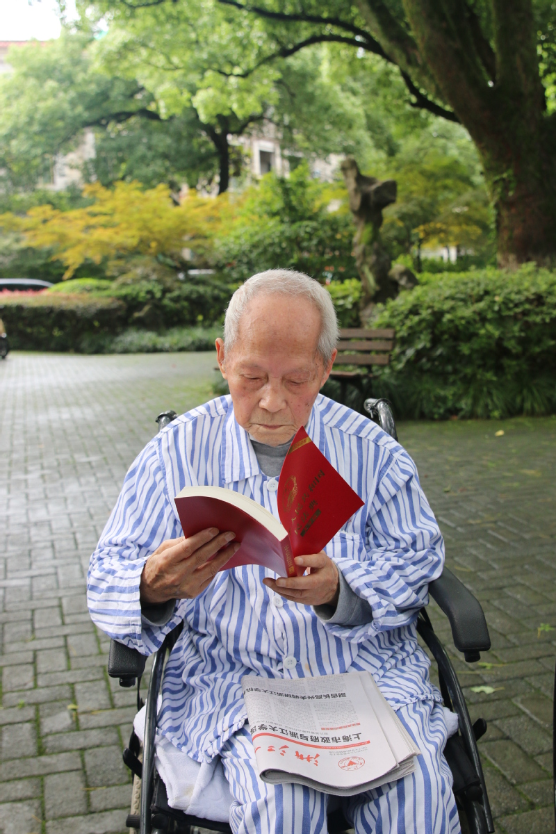 94岁高龄、曾参加过抗美援朝的方舟说:“我们现在虽然身体行动不便,要坐在轮椅上,但还是要追求精神生活,不能停止学习。感谢总支和支部来看望我们。放心吧!革命人永远是年轻!”71年党龄、离休第三党支部郑国铨一拿到学习资料就认真阅读起来。离休干部“活到老学到老”的精神境界令人感动。