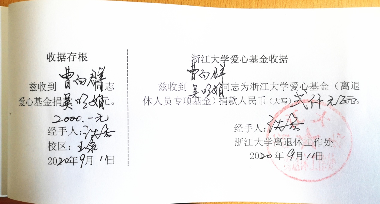 图为曹向群代表本人和妻子吴明娟为“学校爱心基金离退休人员专项基金”捐款2000元(2020年9月11日)。