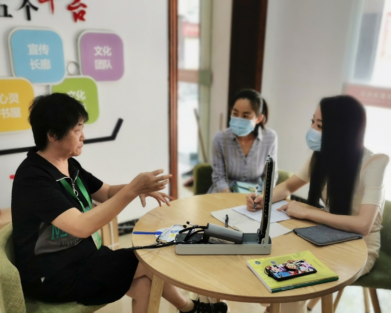 “请坐到这边来,把手臂放在这里”,当我们去采访王沁亚时,她正戴着志愿者胸牌,非常专注细心地为退休老同志恵淑坤在测量血压。一见到我们,恵老师就忍不住地连连夸赞道:“王沁亚真是热心肠,大家都知道的,今天下午她还要陪我去医院看病,我年纪大了,又不会使用支付宝,一个人去医院很害怕的,我们很感谢她的。”
