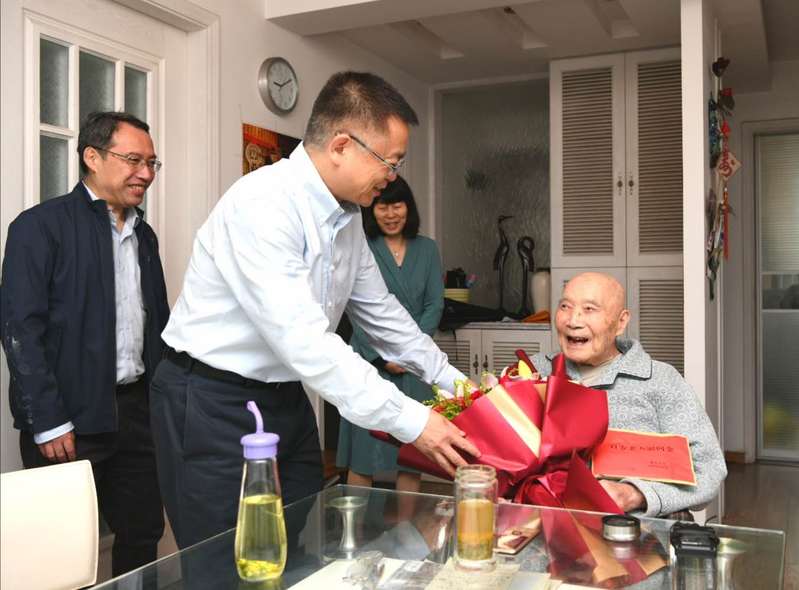 郭老原为航空航天学院教授,与浙大共成长,曾亲历浙大西迁,被陈建功和苏步青点名称赞为数学高才;他还是浙大力学系的“开山鼻祖”,在师资匮乏的五六十年代撑起数学力学系。郭老兴趣广泛,爱一行专一行,桥牌打得很好,曾与中央领导切磋牌技;还爱好京剧,曾任浙江大学京剧队队长。在慰问过程中,大家一同欣赏了郭老在自己百岁寿辰上的京剧演唱视频,看到之前的演唱,郭老眼中充满了享受与陶醉。