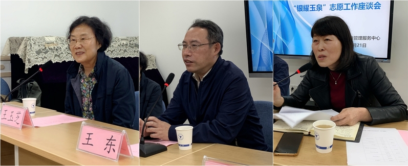 浙江大学党委原副书记、“银耀玉泉”志愿者服务队队长王玉芝认为,这次会议十分及时和必要,她从老龄化社会的需要、实现人生价值、加强精准化关爱等三方面畅谈志愿者工作的意义,希望今后校院二级单位能够一起共同努力,秉承浙大校风,将爱心赋予更多需要关心帮助的老同志,扎实做好志愿者工作。王东对志愿者和学院所做的工作表示感谢,他谈到,志愿工作具有传承性,我们要多关注实际上有困难的人,做到精准区分。朱征对“银耀玉泉”志愿者服务队三个小组所做的工作进行介绍,她谈到,今天的座谈会既是工作总结也是经验积累,学院和老同志提出的意见建议是我们今后工作努力和改进的方向,要以信息化带动精准化和规范化,落实学校“暖心爱心”工程,精准传递关心和关怀,将志愿工作夯实。