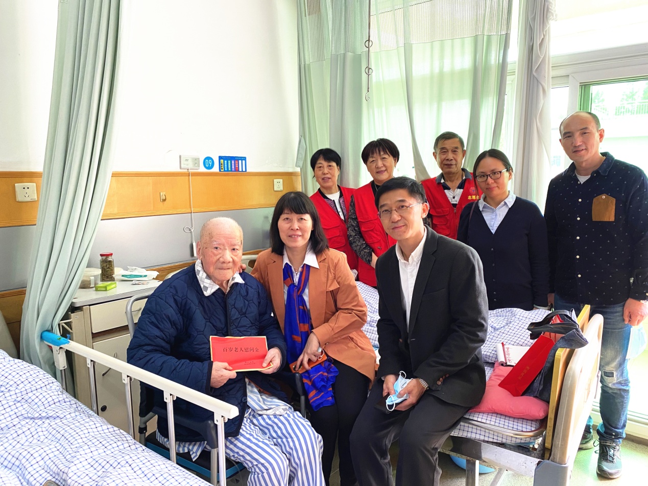 朱征、俞文胜和公共体育与艺术部直属党总支副书记吴子贵、教学管理科科长金瓯贤,携手“银耀玉泉”志愿者于通敏、陈秋静和赵家娣,在浙大校医院玉泉分院慰问百岁老人朱方东。