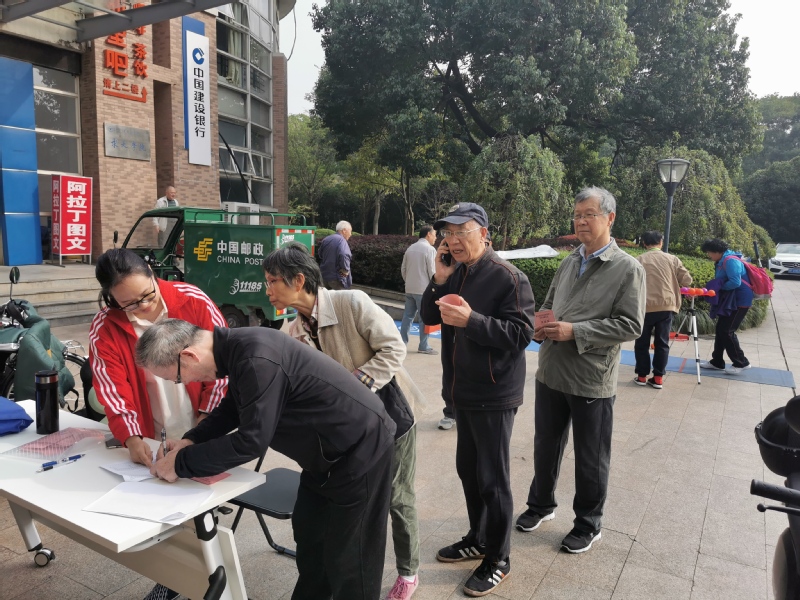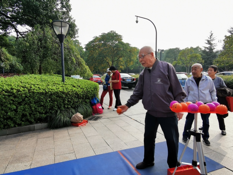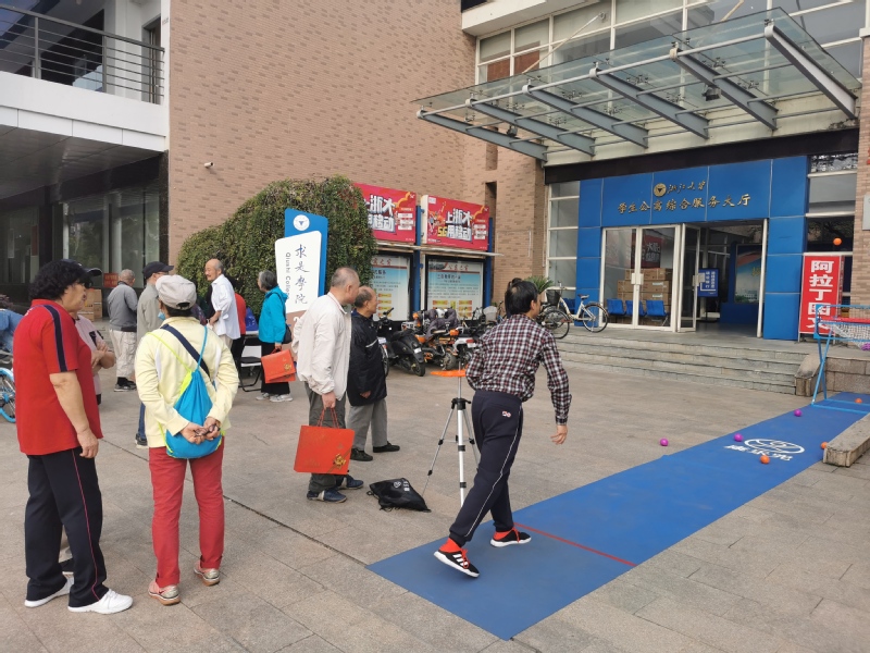 健步走终点处还设置了兜球的现场展示,刚健步走结束的老师们都加入其中,一展身手,针对兜球的相关技术问题还安排了宋丽亚老师专业解答。还有张金凤、崔莲、王素英、麻学俊四位紫金港退休老师志愿协助工作,有了他们的加入,为本次顺利圆满完成提供了有力保障。