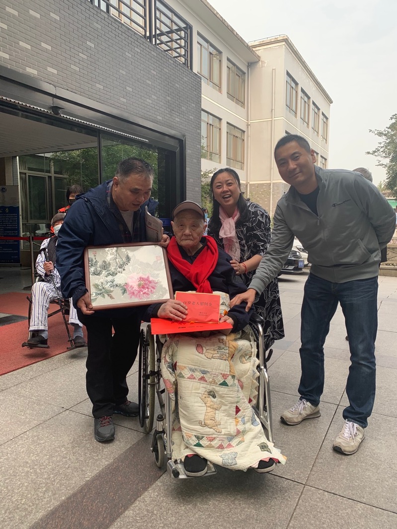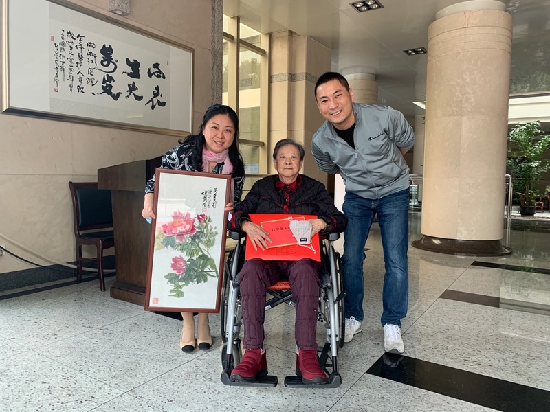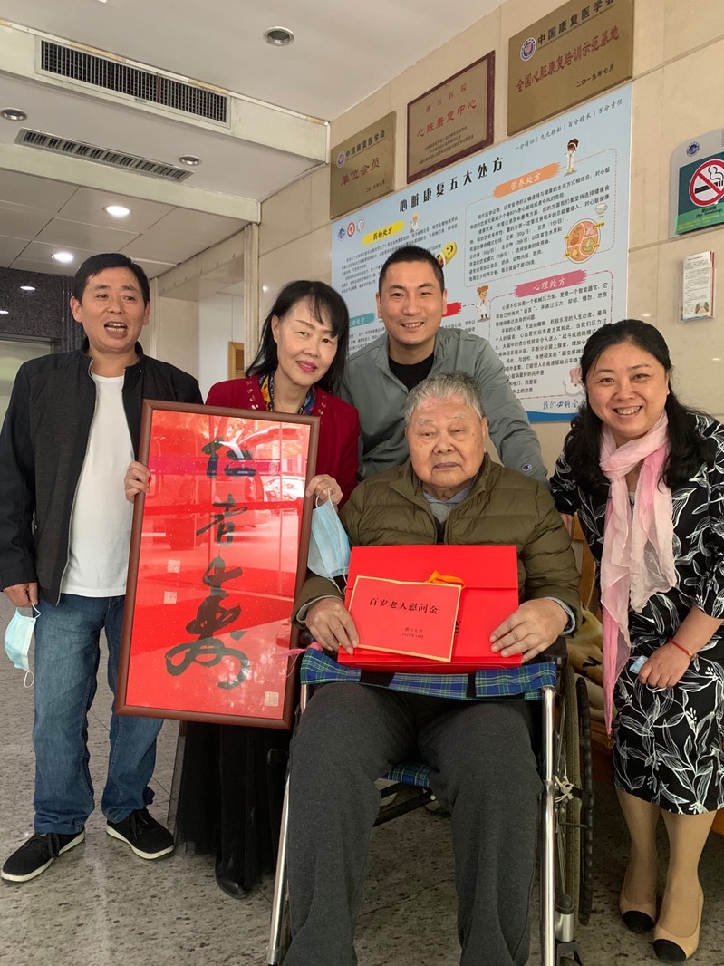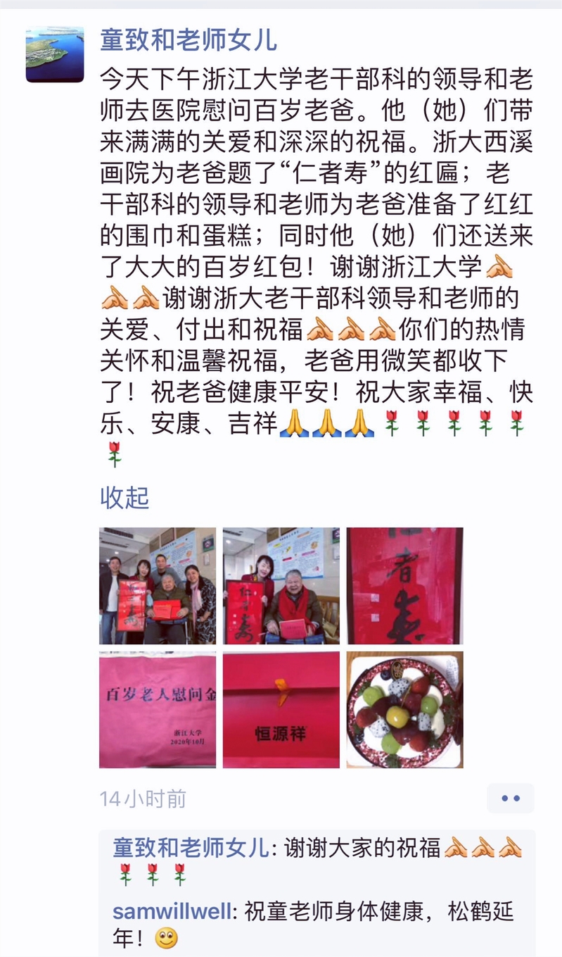 “给童老祝寿啦”,“祝您松鹤长春,幸福安康”。2020年“新晋”百岁老人、离休老干部童致和老师在大家的祝福声中接过师生特地为其所作书法作品“仁者寿”,露出开心笑容。西溪离休党支同时也向老人汇报了学校和处里的工作近况,老人连连点头,为学校各项事业发展点赞。老人子女也非常高兴和感谢,红红的书画匾、红红的围巾、红红的蛋糕、还有百岁大红包.....红红火火的祝寿会,让家人也感受到了浙江大学“满满的关爱和深深的祝福”。