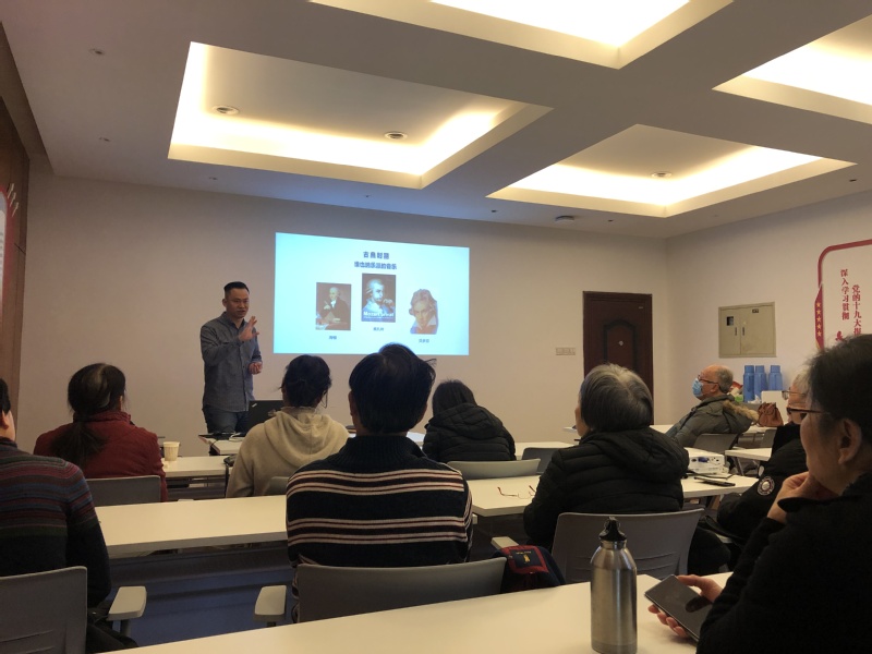在现场,徐老师通过PPT展示,穿插播放音频和视频,细致介绍不同音乐风格与流派的社会背景,并结合该历史时期的人文精神、审美特征,让老同志们切身感受多种音乐流派的魅力,引导大家如何正确理解并欣赏不同时期的音乐,极大提高了音乐鉴赏能力。老同志们认真听讲,积极提问,交流气氛十分热烈,纷纷表示通过徐老师的讲述,对于音乐这一诠释方式有了更深入的理解,受益匪浅,意犹未尽。徐老师也表示,退休老师们能保有如此高的求知热情和蓬勃向上的精神风貌,他也深受感动和教育。