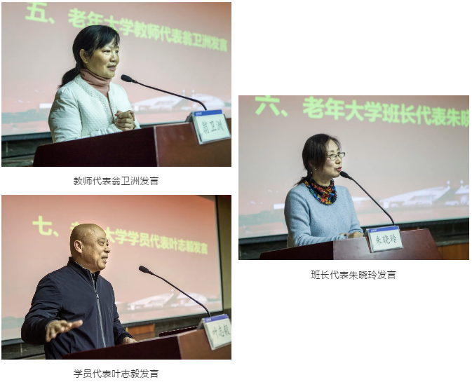 随后,玉泉分校校长卢绍宽、西溪分校校长王文龙、华家池分校校长叶孟兆分别作分校工作报告,介绍各分校20年办学历程,分享寓教于乐、寓学于趣的办学经验。老年大学教师代表翁卫洲、班长代表朱晓玲、学员代表叶志毅依次发言,围绕授课经验、带班方法、学习心得等主题表达对老年大学未来发展的美好祝愿与期待。