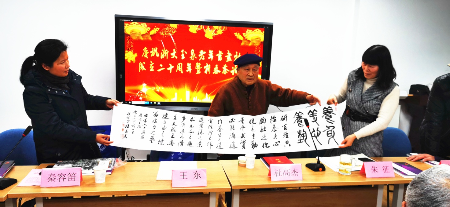 朱征代表书画社給杜高杰教授颁发了《浙江大学老年书画社顾问聘书》。杜教授在会上畅谈了自己的书画体会,还勉励大家要学会三养(养身、养心、养艺),牢记六句话(研学经典、怡养身心、胸融造化、眼高手勤、量中求质、必能渐进),并赠予书画社一幅书画作品和一本《当代大家经典作品•第九辑—杜高杰》,赠予每位与会者一本画册作为纪念。
