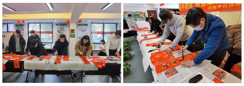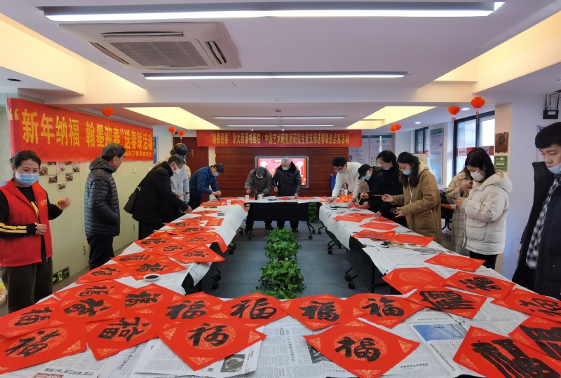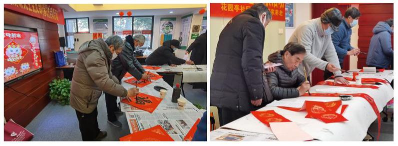 在浙大西溪书画院老教师的带领下,现场十余位师生一起为居住在启真名苑的老同志写春联、送“福”字。现场氛围喜庆,秩序井然,书画院老同志和青年学生联袂创作,挥毫泼墨,为中国传统佳节——辛丑“春节”的到来,送上“订制版”的新春祝福。