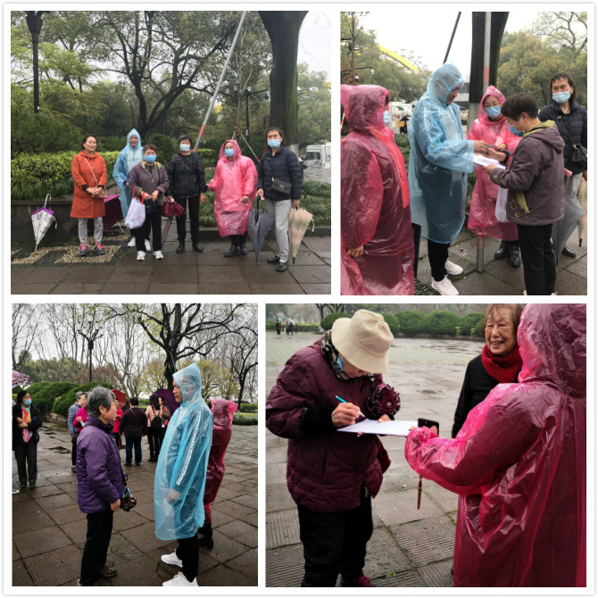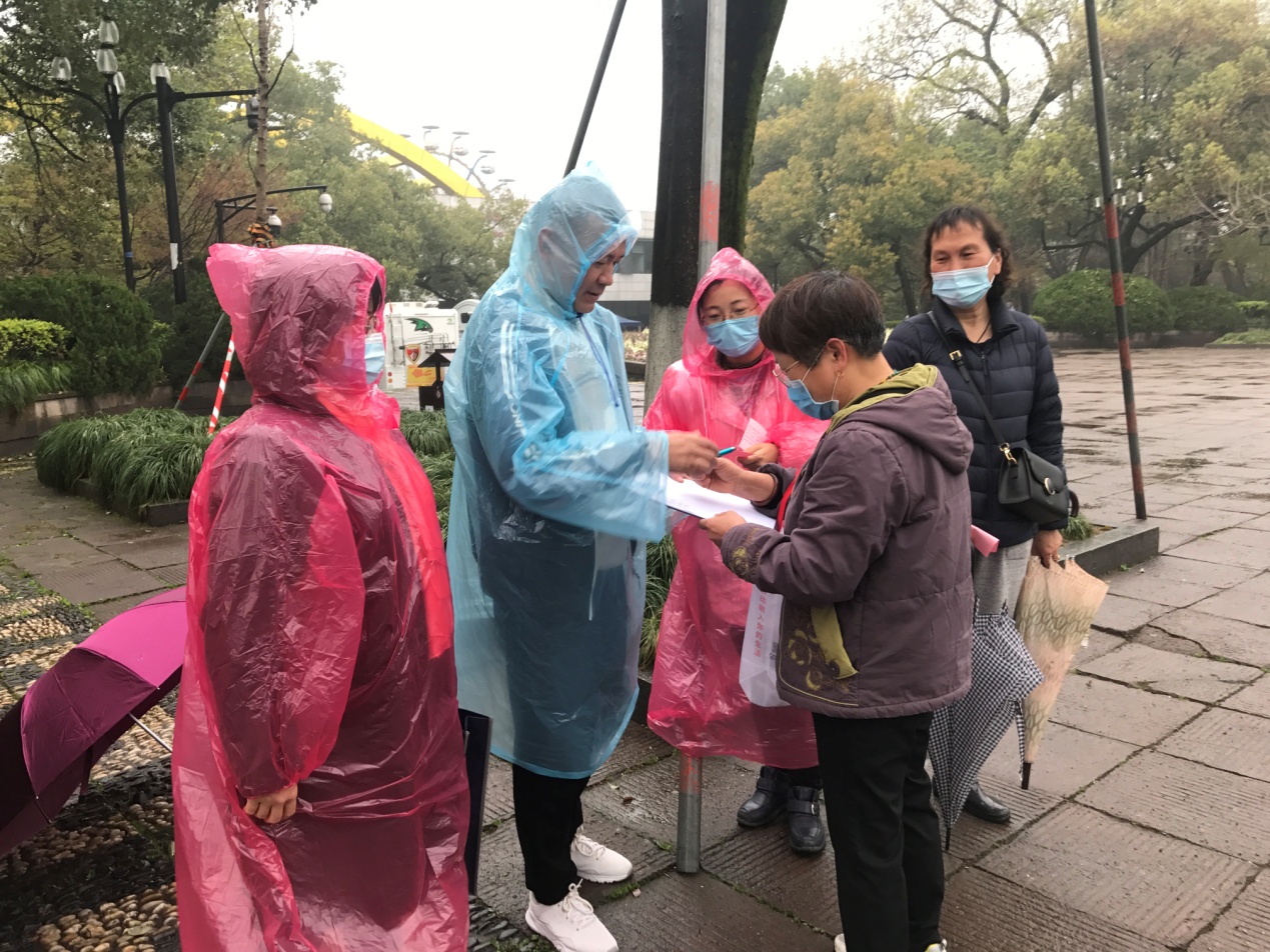 湖滨工作人员一早冒雨在西湖边做好各项服务工作,为方便老同志就近领取纪念品,今年新增孩儿巷发放点,深受老同志好评。