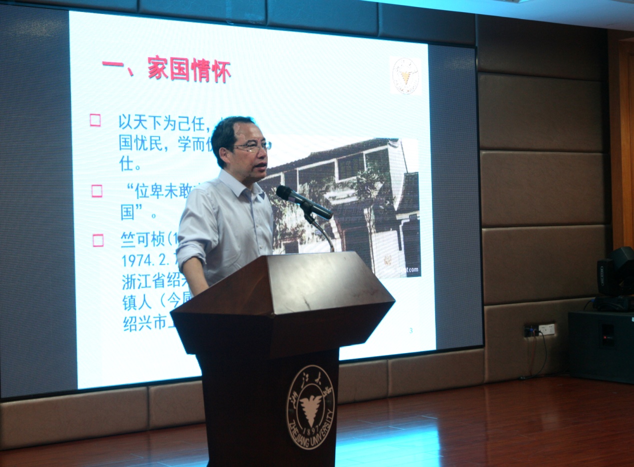 王东作了一场关于优秀共产党员、浙江大学老校长竺可桢院士的生平事迹的报告,他的生动阐述令在场人员全面详细地了解了竺可桢校长的人生传奇。中国近代地理学和气象学的奠基者竺可桢,一生勤俭朴素,一生研究科学。1936年4月,他接任浙大校长。