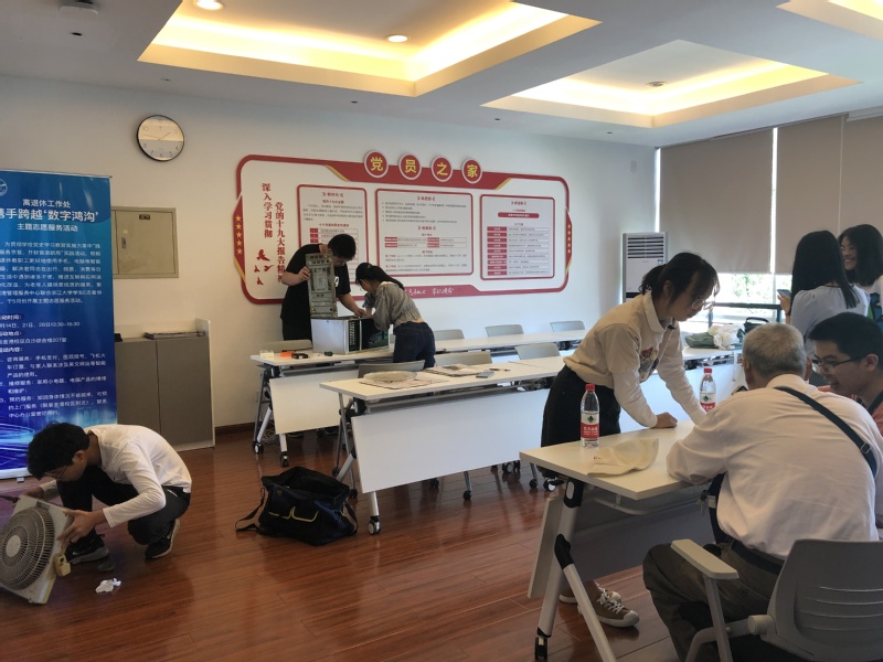 5月14日下午,白沙综合楼207室迎来了第一批服务对象,有的老同志向志愿者咨询智能手机的使用,有的老同志拿来了电脑主机、微波炉等寻求维修帮助。邵健中老师说:“人生中第一部智能手机是女儿淘汰下来给他的,不会用,一直放在柜子里。现在出去买个菜、看个病都要刷手机,走到哪里都要刷一下,可是我不会呀。今天来向志愿者同学们学习了很多,下周五我还来,一定要学会用智能手机!”。周奕青老师向志愿者们详细了解手机下载软件的过程,成功下载了围棋软件后她非常开心。根据她需求,两位志愿者还前往她港湾家园的家里,连接并教会了如何手机投票到电视,以后上老年大学的线上课程就能看得更加清楚啦。