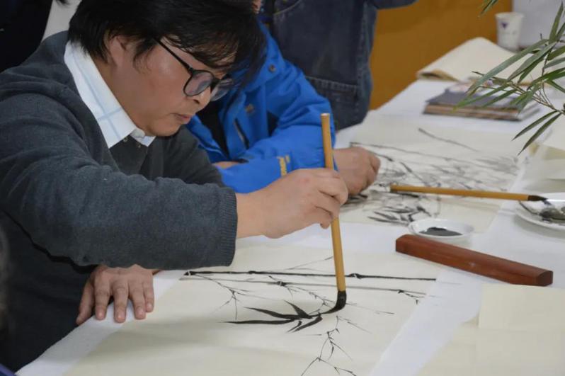 梅波老师首先在中心多媒体教室向大家讲解了我国历代画竹子的名家和名作,随后给大家演示墨竹画法,他概括为位置、立竿、点节、分枝、布叶和竹态等六个方面要点,并耐心指导大家临摹。