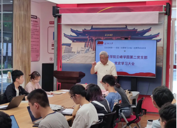 2021年5月14日,云峰学园第二党支部于紫云四舍党员之家开展了党章学习小组讨论活动,活动邀请了浙江大学关工委求是宣讲团成员刘祥官老师参加。