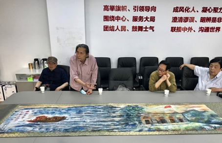 年逾80的艺术家毛正棠老师将精心绘制的巨幅画作“一大红船”赠与学院收藏展览。图为毛正棠老师声情并茂地讲解画作创作过程,表达对建党100周年的满怀激动之情。