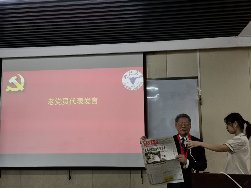 老党员代表张孙玮发表感言。他首先表达了对党中央、学校党委、系党委的感谢,并分享了自己的入党初心及在党55周年的心声。他表示自己仍然是“新一代”,在党的教育领导下,仍需不断努力、不断学习、吐故纳新。他寄语当代青年要听党话、跟党走,锤炼政治品质、坚定理想信念,再接再厉、一往无前,做一名永不褪色的共产党员。