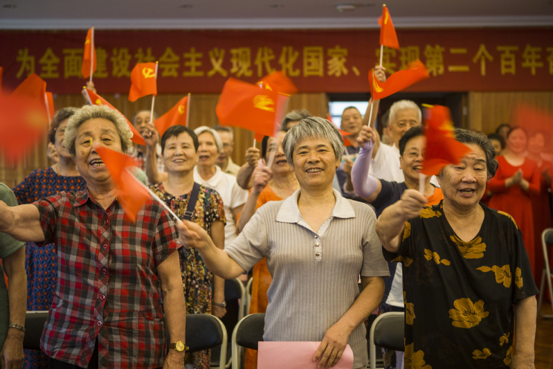 在88岁高龄的离休干部张大炎的带领下,数十位银发老同志手执鲜红的党旗和国旗,共同唱响《社会主义好》这一铿锵有力的歌曲,拉开了本次歌咏会的序幕。