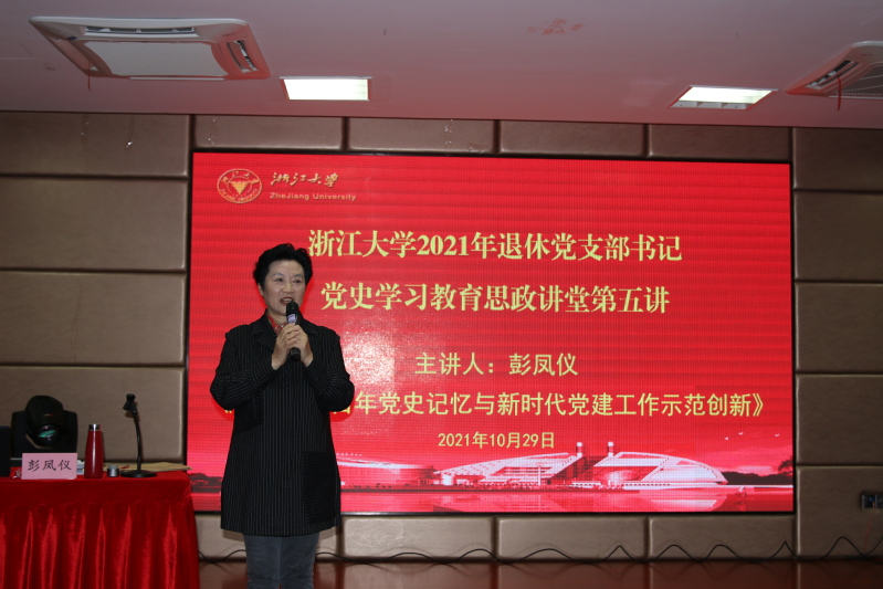 本次讲座邀请了浙江大学关工委求是宣讲团副团长、浙江省关工委红色讲师团成员彭凤仪教授作《浙江大学百年党史记忆与新时代党建工作示范创新》专题报告。校退休党支部书记代表、退休党员骨干代表、离退休工作处党支部全体党员等近百人参加报告会。报告会由离退休工作处副处长朱征主持。