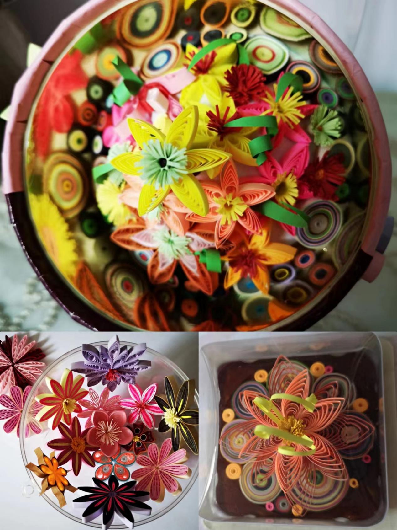 在线上线下学员的期待中,衍纸艺术教学课在蓝田学园蓝三辅楼206拉开帷幕。学员们聆听着着衍纸手工爱好者、“银耀华家池”志愿者服务队队长高佩云老师的讲授,学习使用镊子、珠针、定型板、卷纸笔等成套衍纸制作工具,在画板上勾勒出一幅幅精美绝伦的作品。