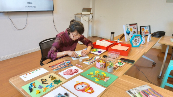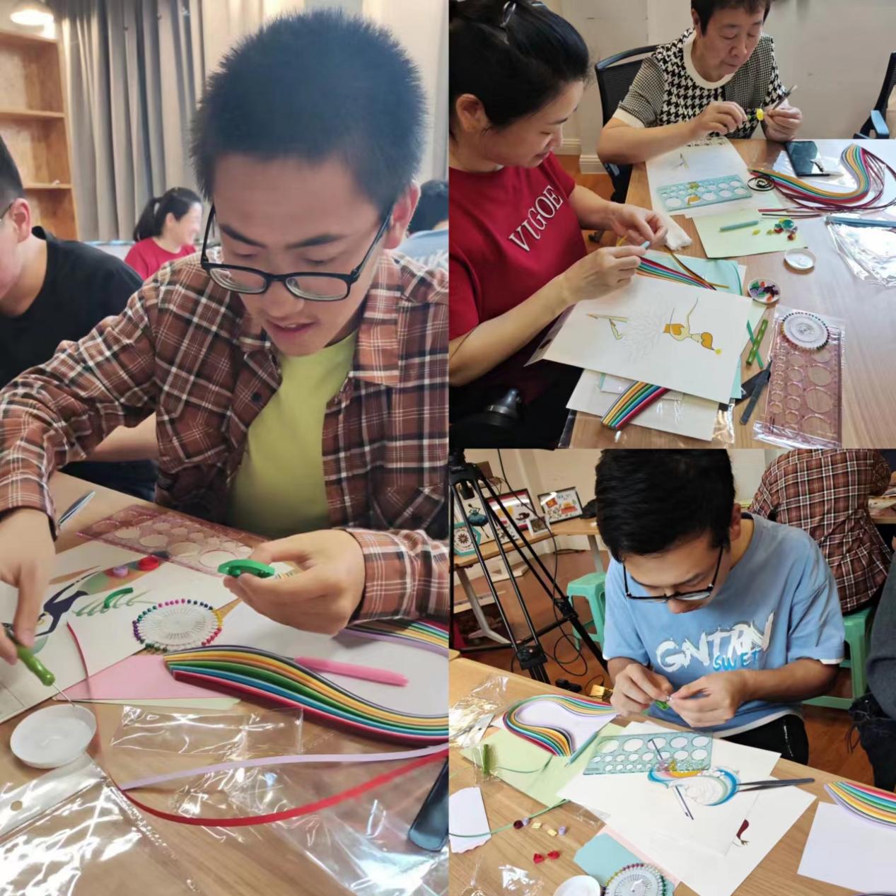 活动现场,大部分学员都是第一次接触衍纸艺术,所以对具体的操作方法不甚了解,一时不知从何做起。在高老师的悉心指导下,大家的动作慢慢熟练起来。弯曲、捏压、拼接、粘贴……每一位学员的积极性都很高,埋头做得不亦乐乎。“螺旋卷纹的制作,是在松卷的基础上做的,卷的时候控制力度的大小,从而控制卷纹的疏密,有时力度太大导致卷纹过紧的话可以放在模板上用珠针定型,调整疏密。”课堂上,高老师将自己十多年来积攒的衍纸制作经验倾囊相授,“各部分零件制作好后就可以粘贴了,一定记得少涂胶水,在某几个点就好了,方便造型调整,或者拆卸,刚开始胶水涂得太多容易拆毁纸卷,甚至会连累到周围的零部件……”学员们边学边做,偶尔还拿起笔记录一些高老师强调的重点和易错点,将刚刚学到的经验和操作精髓付诸实践,在手脑互相配合的过程中收获了满满的快乐。