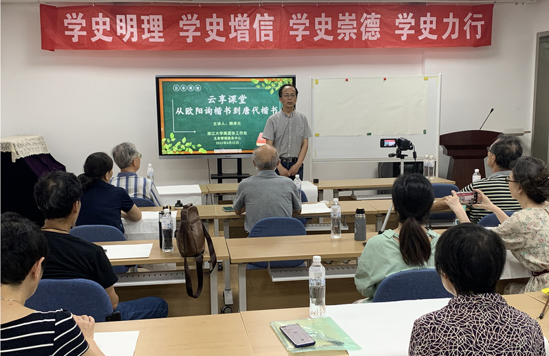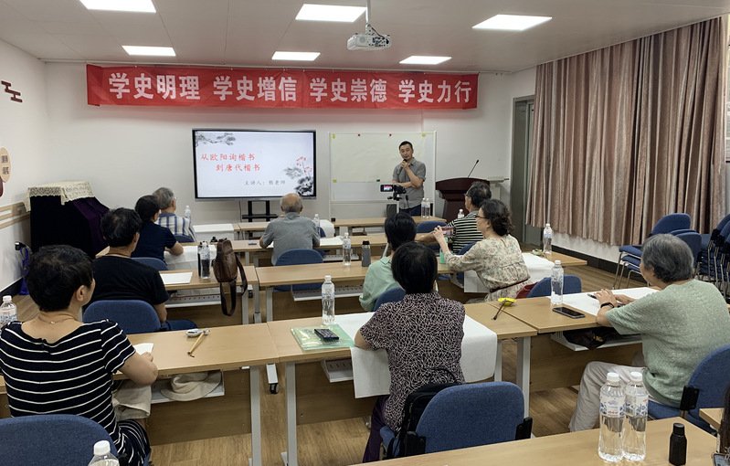 2022年6月22日下午,离退休工作处玉泉管理服务中心特邀定安书院院长、河北美院特聘教师熊孝元老师担任主讲嘉宾,他带来的课程是《从欧阳询楷书到唐代楷书》。熊老师先后对欧阳询、虞世南、褚遂良、颜真卿、柳公权等五位名重一时的楷书大家进行介绍,细说楷书的发展和贡献。