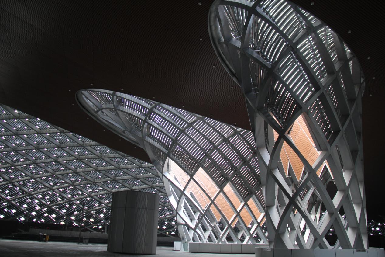 再来看号称“小莲花”的网球决赛馆,她由24个固定花瓣和屋盖上8片开闭花瓣组成,每片开闭花瓣都带有转轴,8片花瓣绕各自的转轴转动,开启时,沿逆时针转动,从空中俯视,“花瓣”张合同步,动静得宜。此外,“小莲花”内的网球决赛比赛场地实现了仅仅依靠一台平板电脑就能控制整个场馆灯光,能够满足比赛的全球转播要求。更值得一提的是,场地地面虽然仅有4毫米左右的厚度,却有足足12层,用“薄如蝉翼”来形容毫不为过。