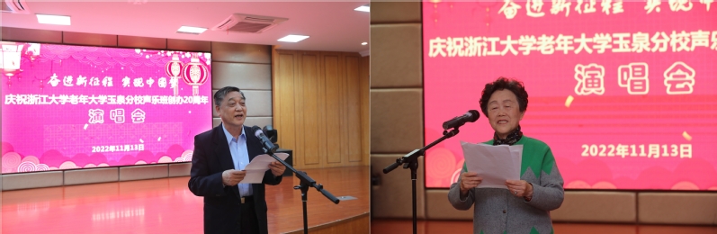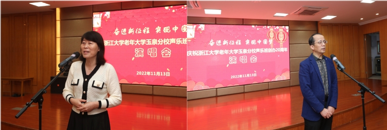 2021年11月13日上午,浙江大学老年大学玉泉分校声乐班在玉泉校区教工活动中心二楼隆重举办创建20周年演唱会。离退休工作处班子成员朱征、韩东晖,校老年大学副校长、玉泉分校校长卢绍宽,玉泉分校副校长吕思菊、吴国忠、翁卫洲、王萍,玉泉管理服务中心副主任张晓亮和声乐班全体学员参加了本次活动。