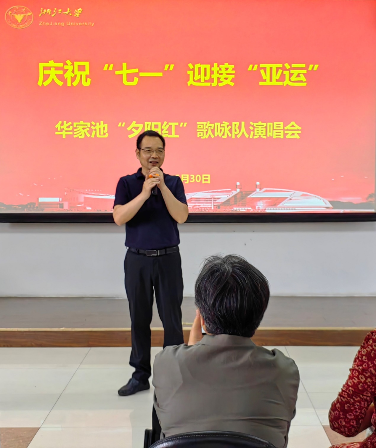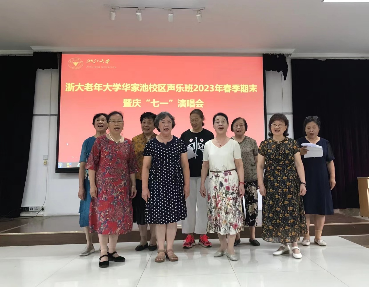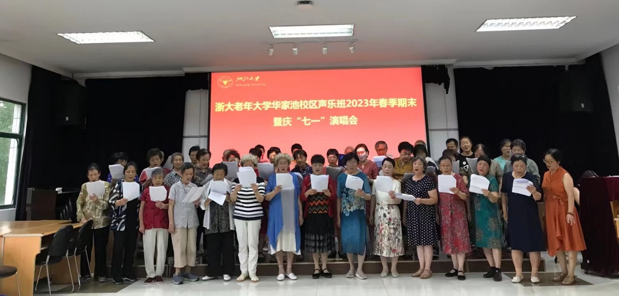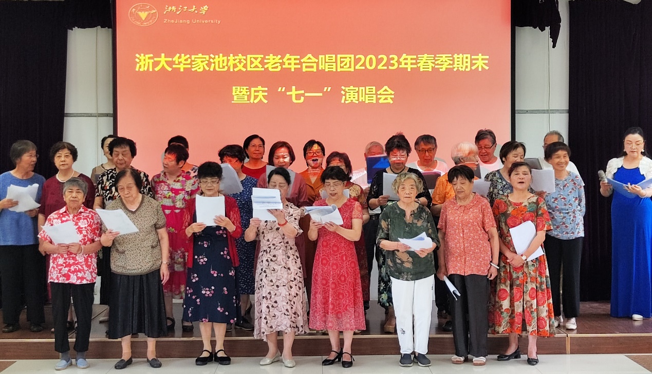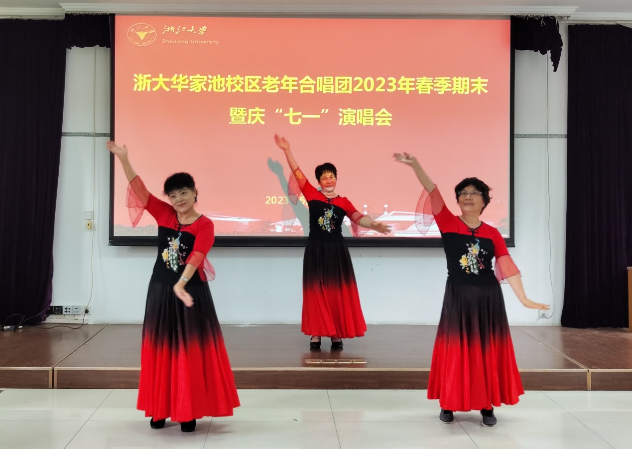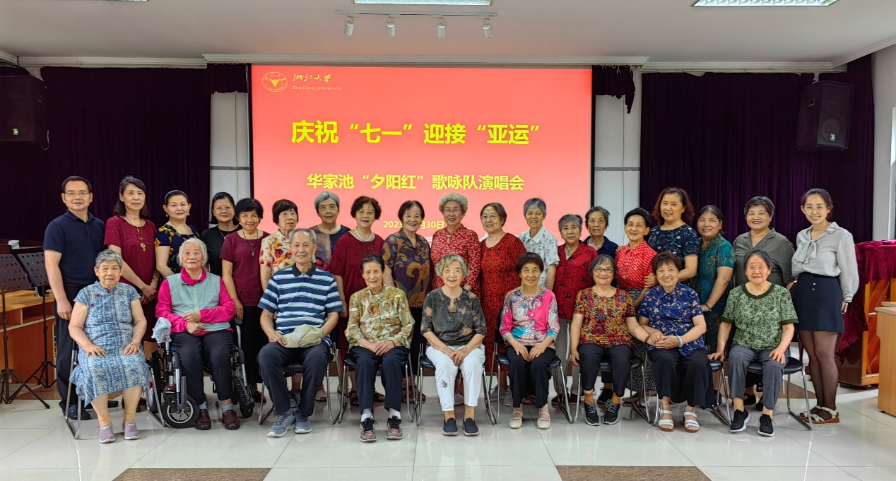 为庆祝中国共产党成立102周年,迎接杭州第19届亚运会,6月29-30日,浙大华家池校区老年合唱团、浙大老年大学华家池校区声乐班、华家池“夕阳红”歌咏队成员们欢聚一堂,分别在常青楼三楼多功能厅举办2023年春季期末暨庆“七一”演唱会。离退休工作处副处长兼离休党工委副书记陈立明、华家池管理服务中心副主任张晓昀参加演出活动。