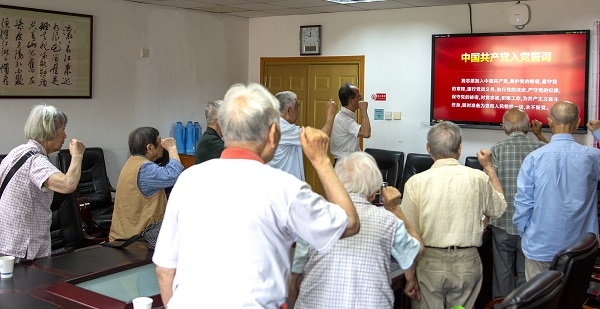 在鲜红的党旗下,全体老党员佩戴党员徽章,眼神坚定,高举右手,怀着满腔赤诚,在韩东晖的领誓下,重温入党誓词。铿锵有力的宣誓,让老党员们再次接受了精神上的洗礼,感悟共产党人的初心使命,铭记党员的责任与担当。