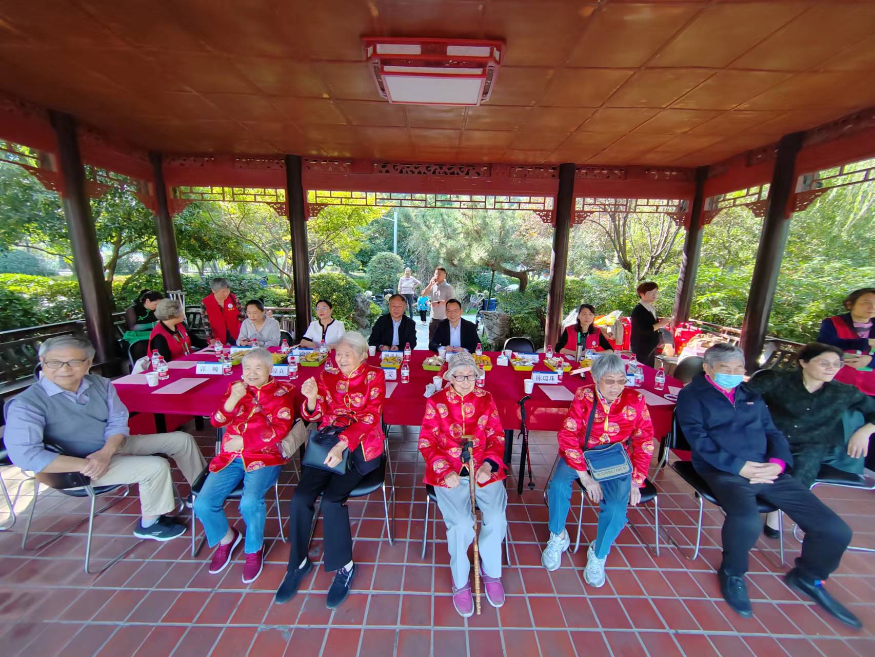 最后,与会领导为老同志送温暖,全体与会者在桂花亭前合影留念。