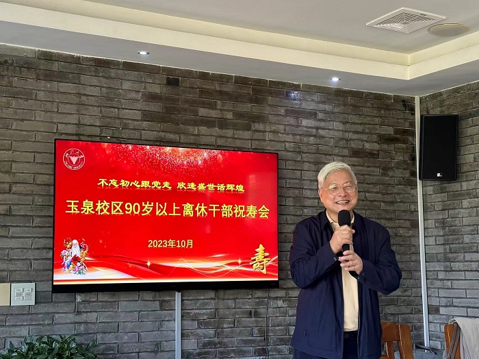 韩东晖介绍了玉泉校区离休干部的整体情况。玉泉校区现有离休干部54人,90岁以上的有53人,平均年龄超过94岁。我处将继续探索适合老干部的活动形式,丰富老干部的精神文化生活。祝老干部健康长寿!生活美满如意!向百岁目标进军!