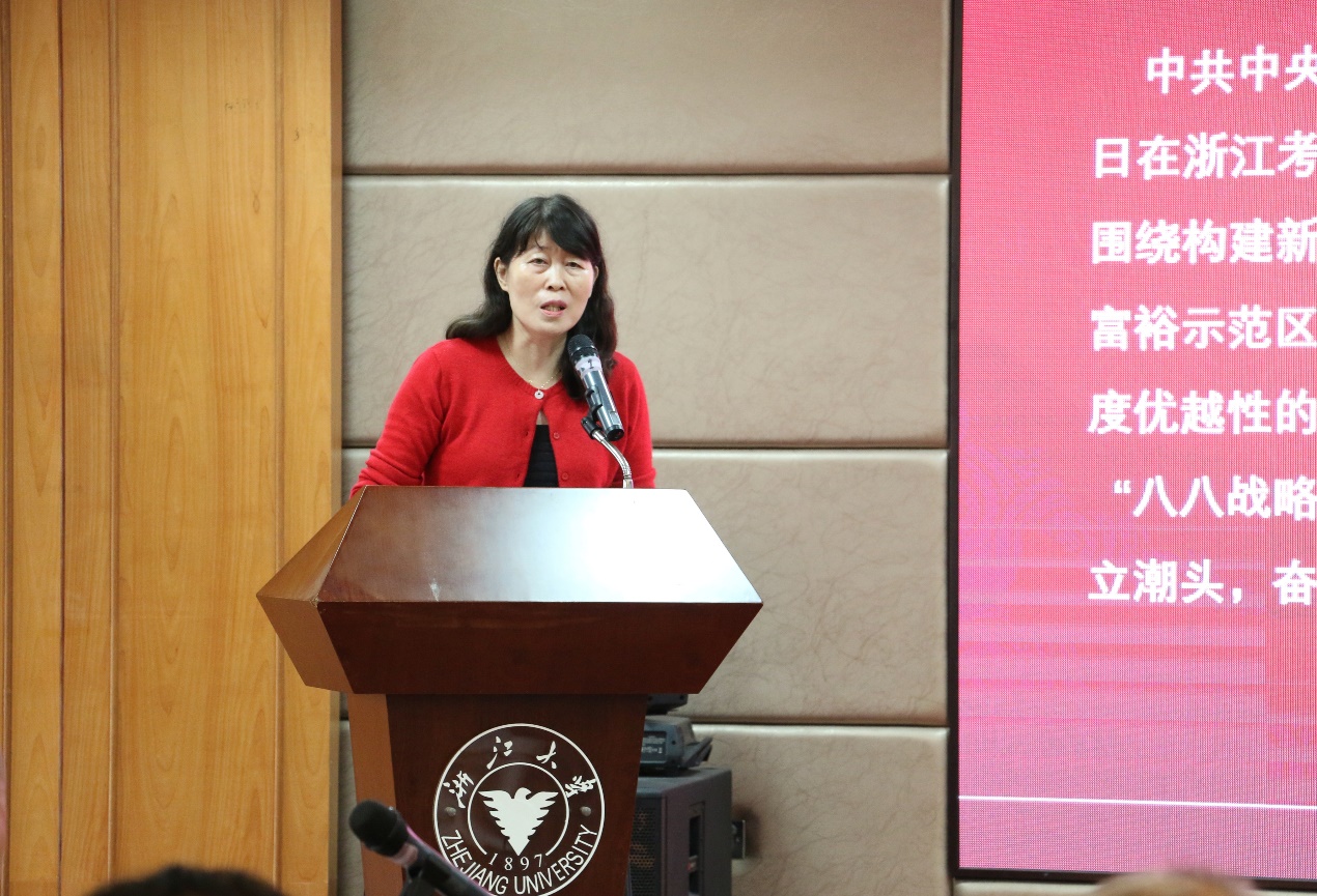 朱征首先向大家传达了习近平总书记考察浙江的重要讲话精神,并向大家分享了自己对总书记本次重要讲话精神的理解。朱征提到,习近平总书记这一次来浙江是浙江发展史上又一重大里程碑,他在考察期间表示希望浙江成为中国式现代化的先行者,这是对浙江的肯定也是对浙江提出的新要求。总书记本次在浙江考察期间表现出了对浙江的深情大爱,可见他在浙江的6年时间一定是怀着莫大的热忱工作。更重要的是,总书记提出的“八八战略”已实施20周年,也给浙江带来了精彩蝶变,浙江实现了历史性的跃升。接下来,我们应持续推进“八八战略”走深走实,续写好“八八战略”新篇章,为浙江努力实现习近平总书记提出的新定位和新要求做出浙大贡献。