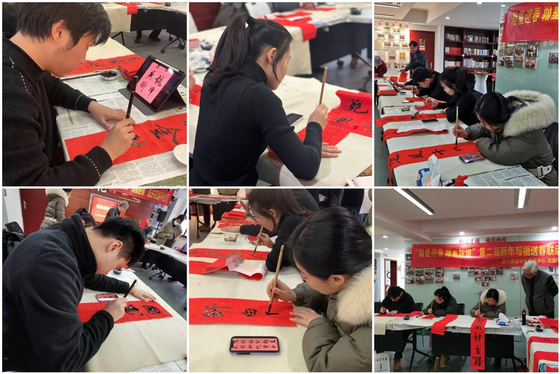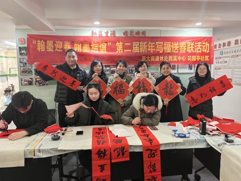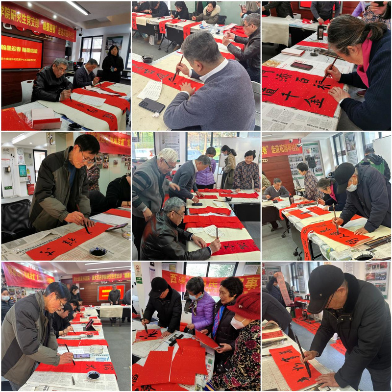 “提冬数九”,民间俗语都说三九天最冷,西溪校区邻近花园亭社区的启真为老服务中心在1月9日这一天的下午却是人声鼎沸、满堂温煦。周边居家养老的我校退休教职工、同一个生活社区的银龄邻居们,相互招呼着,开开心心到现场来“淘”春联、“淘”福字、会新老朋友。从2021年到2024年,时隔两年,浙大西溪书画院联合艺古学院研究生党支部的“翰墨迎春 长少结谊”活动恢复运行!书画院老同志和书法专业的小同学挥毫泼墨,携手为社区高龄老人送上美好祝福、同迎甲辰龙年!