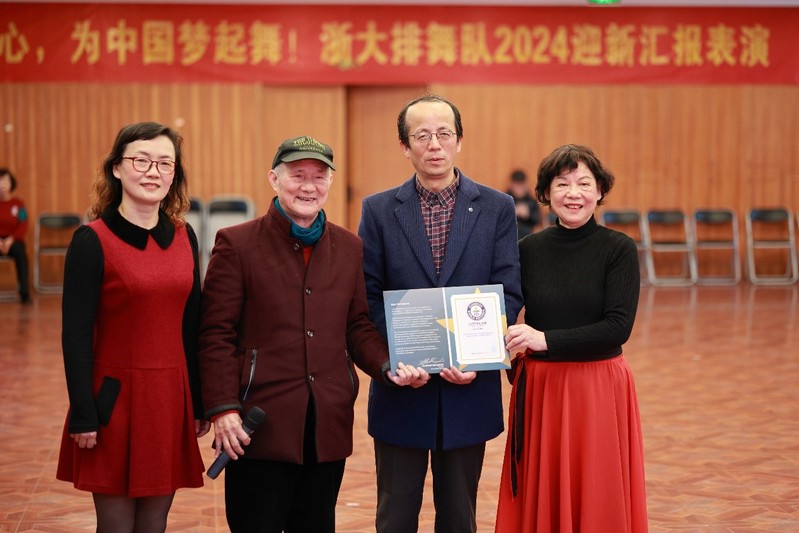 最后排舞队老队长齐佩芳和年近八十岁曾参加破国际吉尼斯世界纪录比赛的男队员陈立铭回顾了排舞队的辉煌历史,将美好又值得纪念吉尼斯世界纪录证书赠送给离退休工作处作为永久纪念。