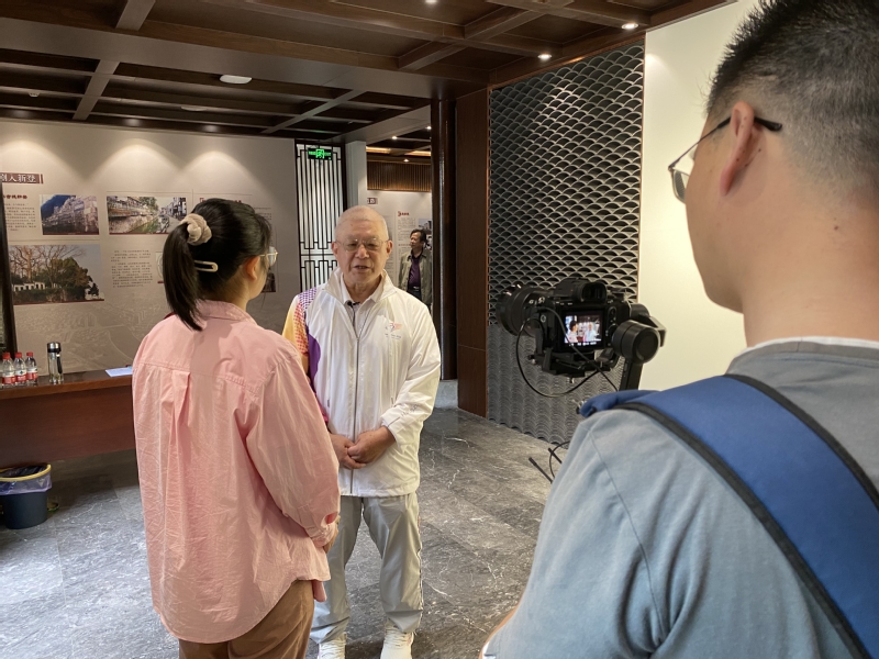 参观队伍恰逢富阳电视台采访活动,文体骨干金中仁老师接受采访并发表自己参观新登和徐玉兰艺术馆的感想。