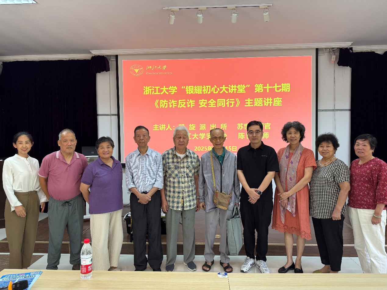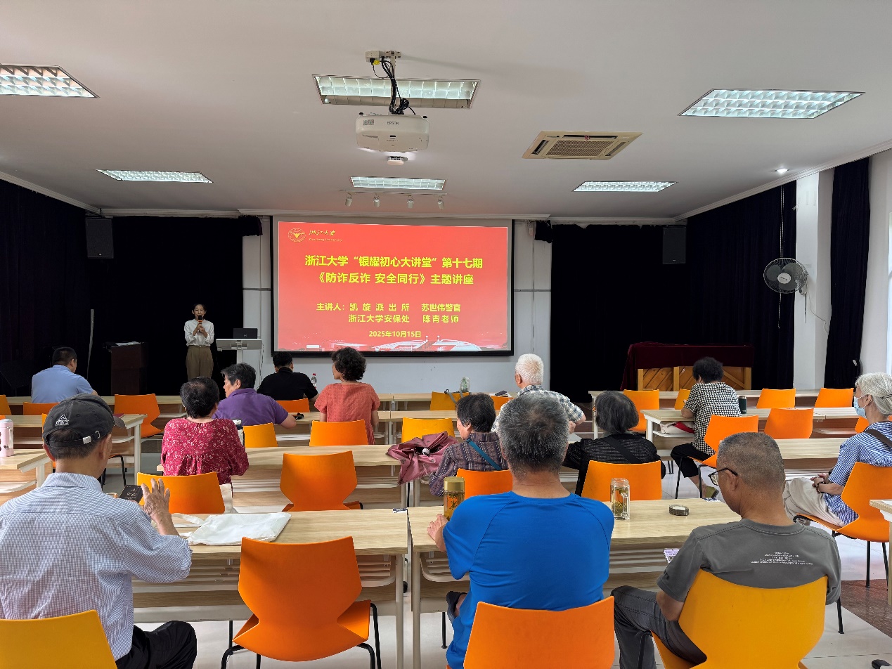 为切实守护学校离退休老同志的人身及财产安全,进一步提升老同志防范诈骗、应对安全风险的能力,10月15日,“银耀初心大讲堂”第十七期安全专题讲座在华家池校区常青楼三楼报告厅举行。离退休老同志在轻松易懂的讲解与互动交流中,系统学习安全知识,共同筑牢安全防线。