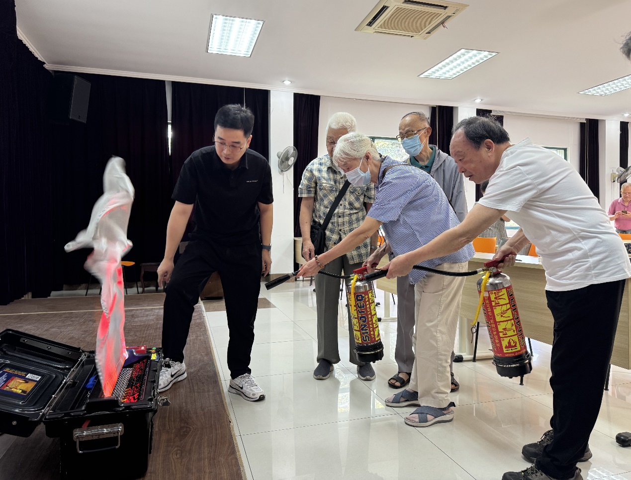 在互动环节,陈青老师用电子灭火模拟器向老同志现场演示灭火器“提、拔、握、压”的具体使用步骤,并指导老同志现场操作“灭火”,帮助大家将理论知识转化为实际应对能力。讲座现场还向老同志们发放了防范电信网络诈骗宣传单,方便老同志带回家与家人一起学习,时刻提醒自己与家人提高防诈意识。