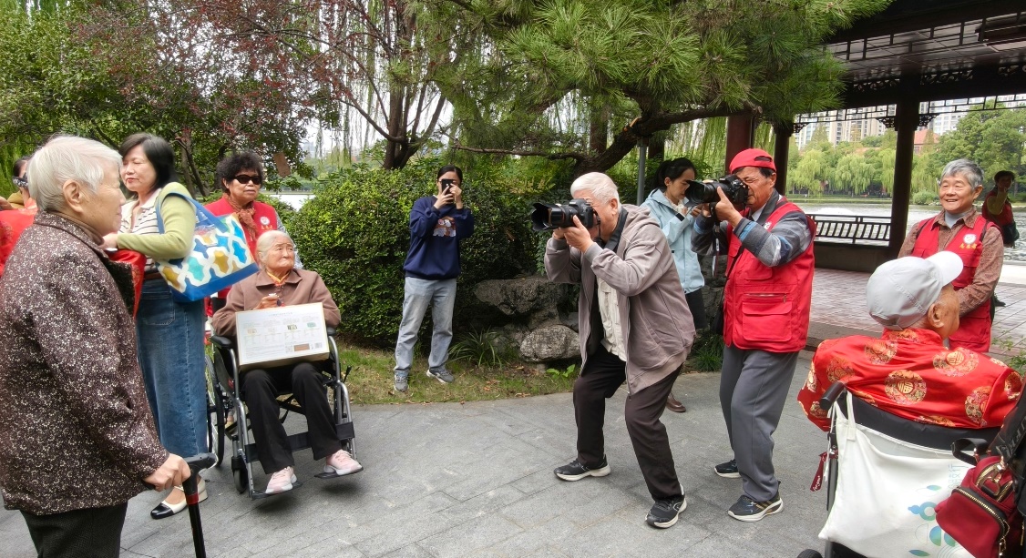 活动结束后,志愿者与帮扶的老同志共同前往桂花亭,在华家池畔环湖走,并开展“银暖夕阳·时光流影”摄影专项活动,有摄影专长的流动志愿者为老同志拍照留下美好的回忆。