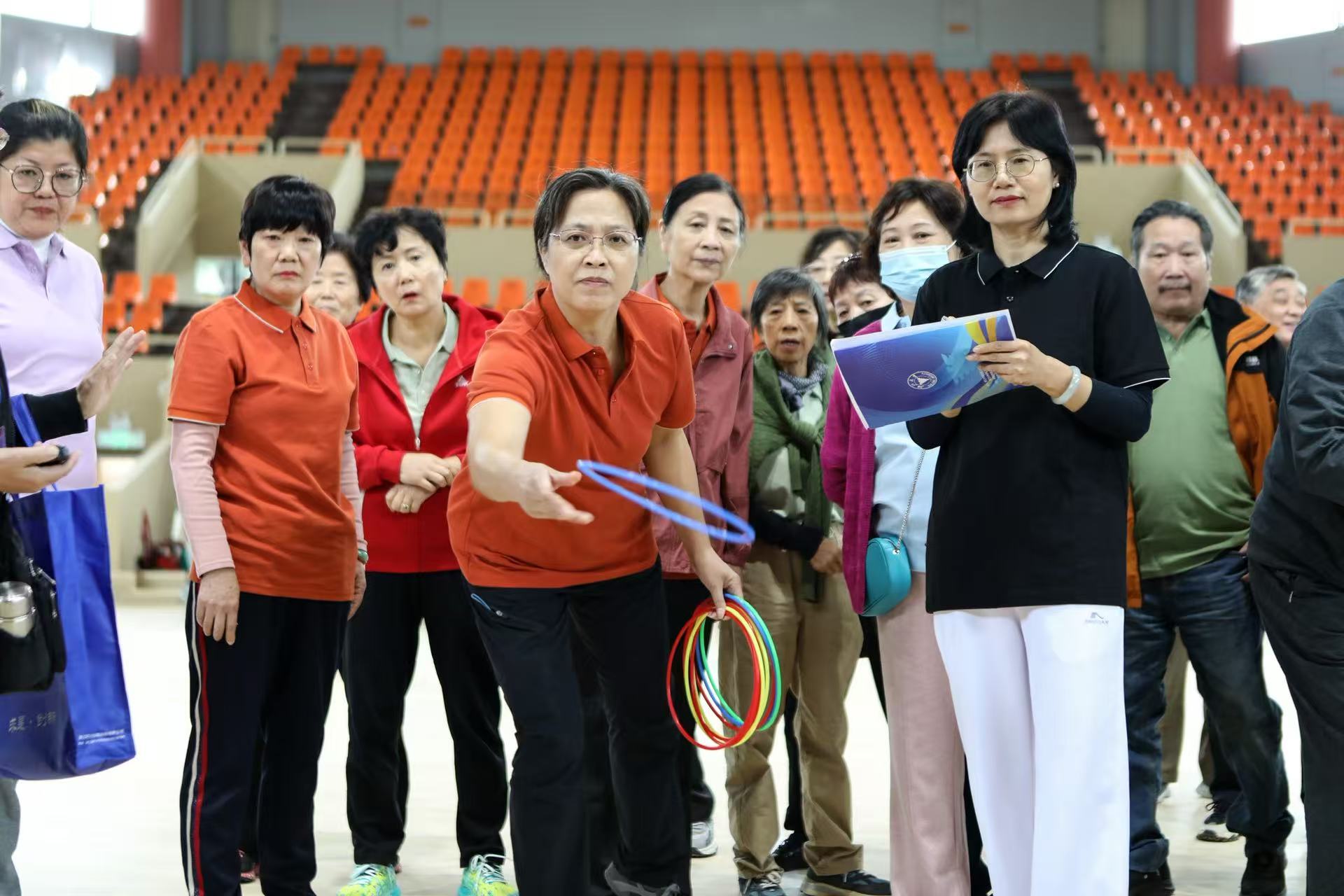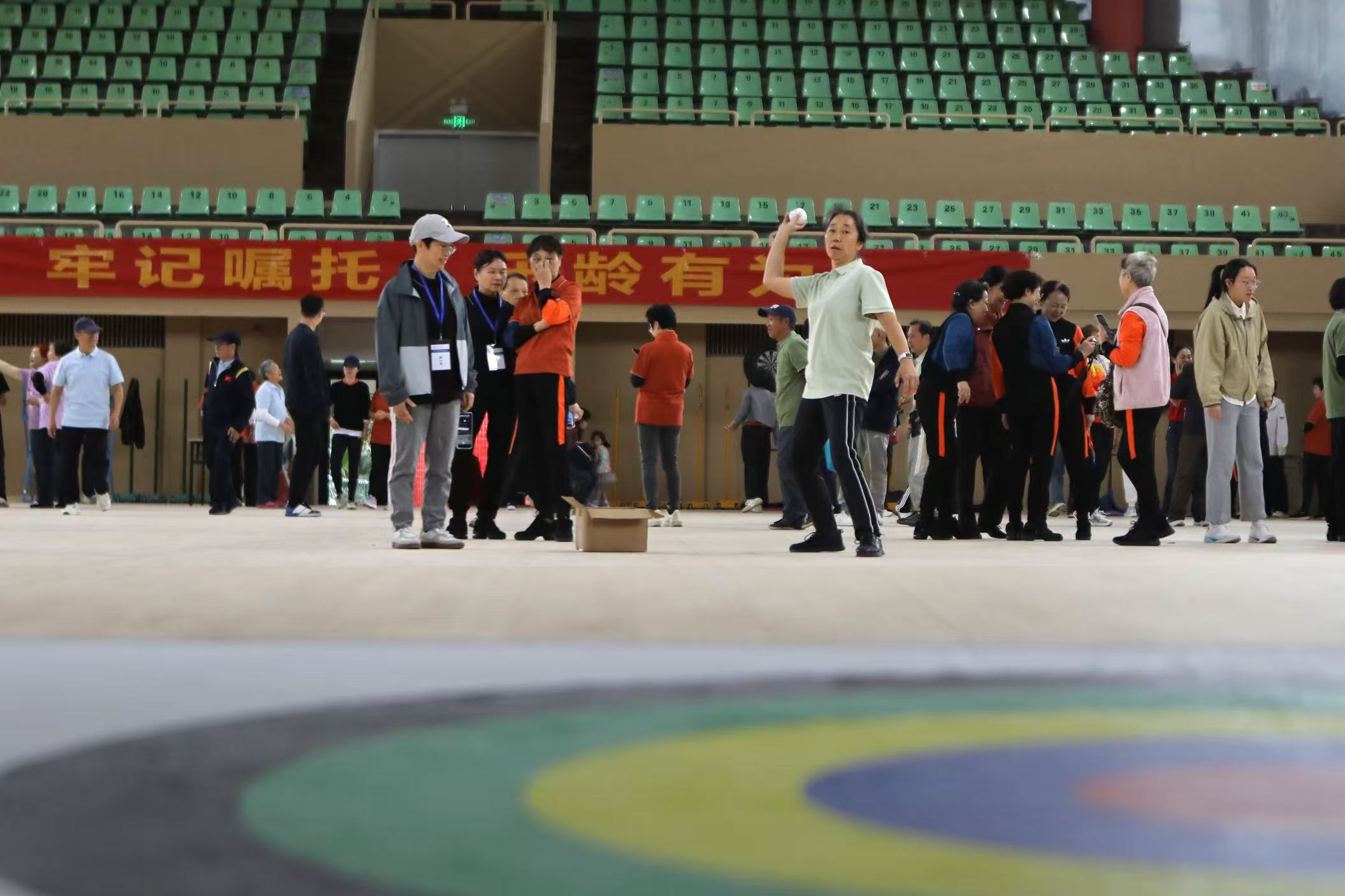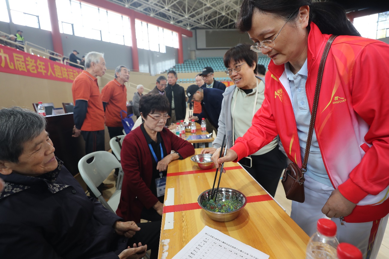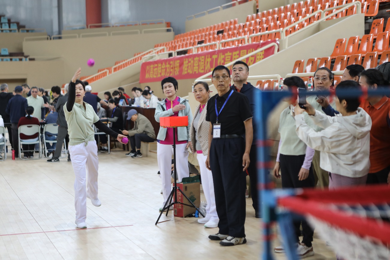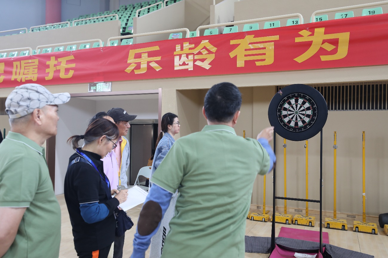定点投篮现场,老同志们个个摩拳擦掌,随着一次次篮球入网,现场喝彩声此起彼伏;飞镖掷准项目中,他们通过控制手臂力量,将镖精准地落在靶心附近,展现出了精准的控制力;在挟弹子比赛中,老同志们用筷子熟练地挟起弹子,灵活的手法让现场观众赞叹;垒球掷准和套圈项目的老同志们手上拿着球和圈,各显身手,尽情享受着运动带来的乐趣。