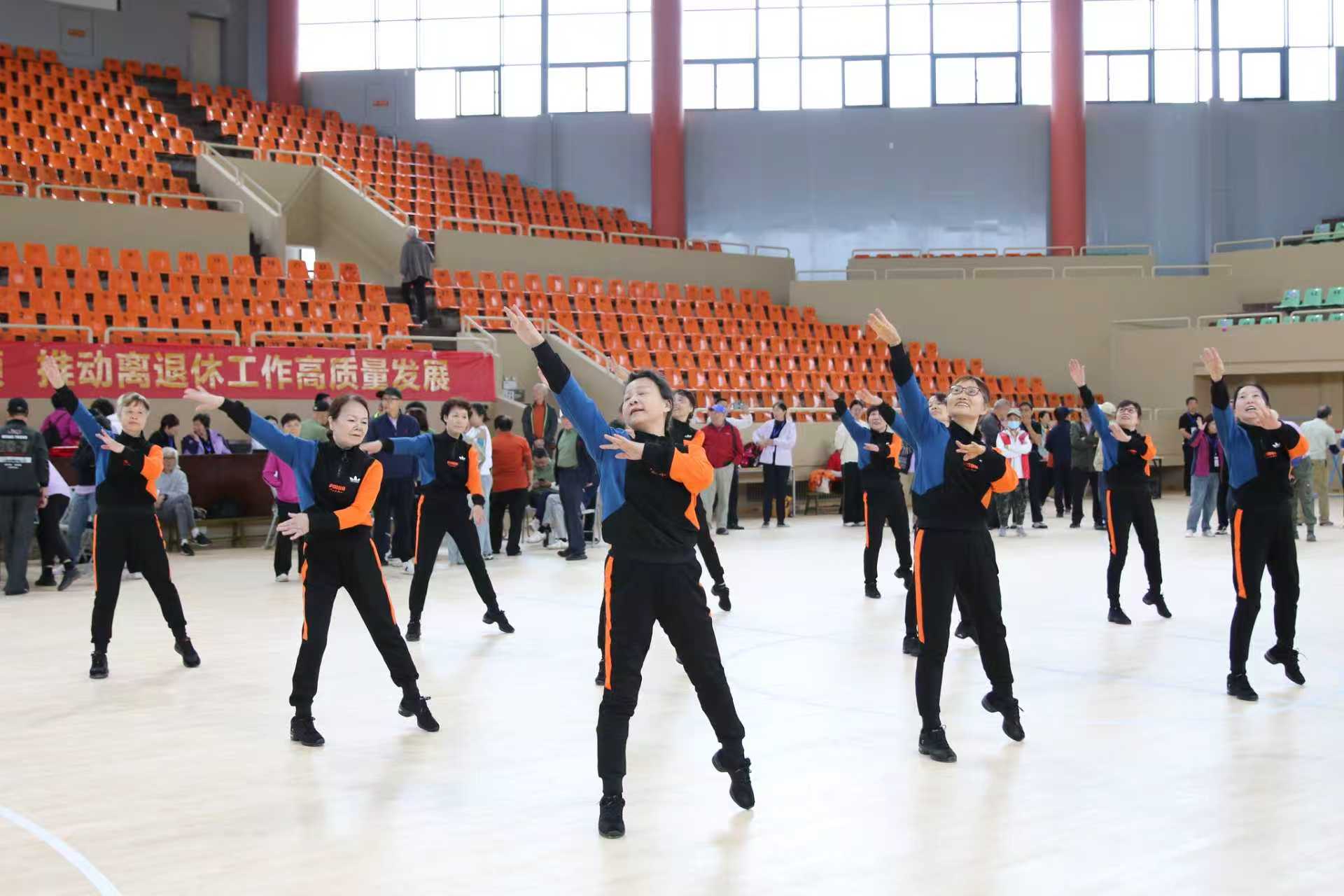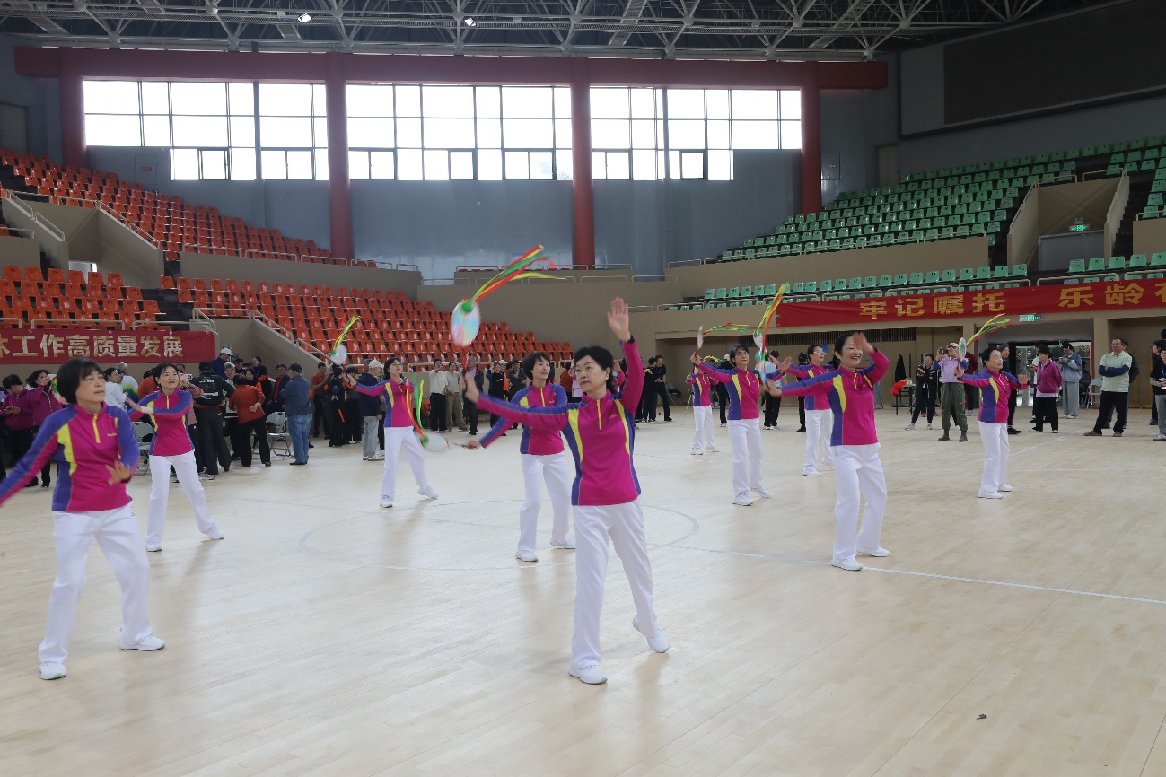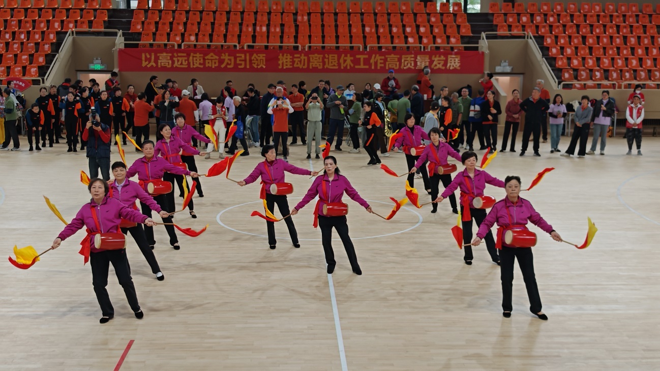 运动会暖场阶段,来自各校区的五支老年体育团队带来了腰鼓、健身操、太极拳、柔力球等多种运动展演,将活力与热情洒满赛场,为即将“出征”的运动员们加油鼓劲儿。