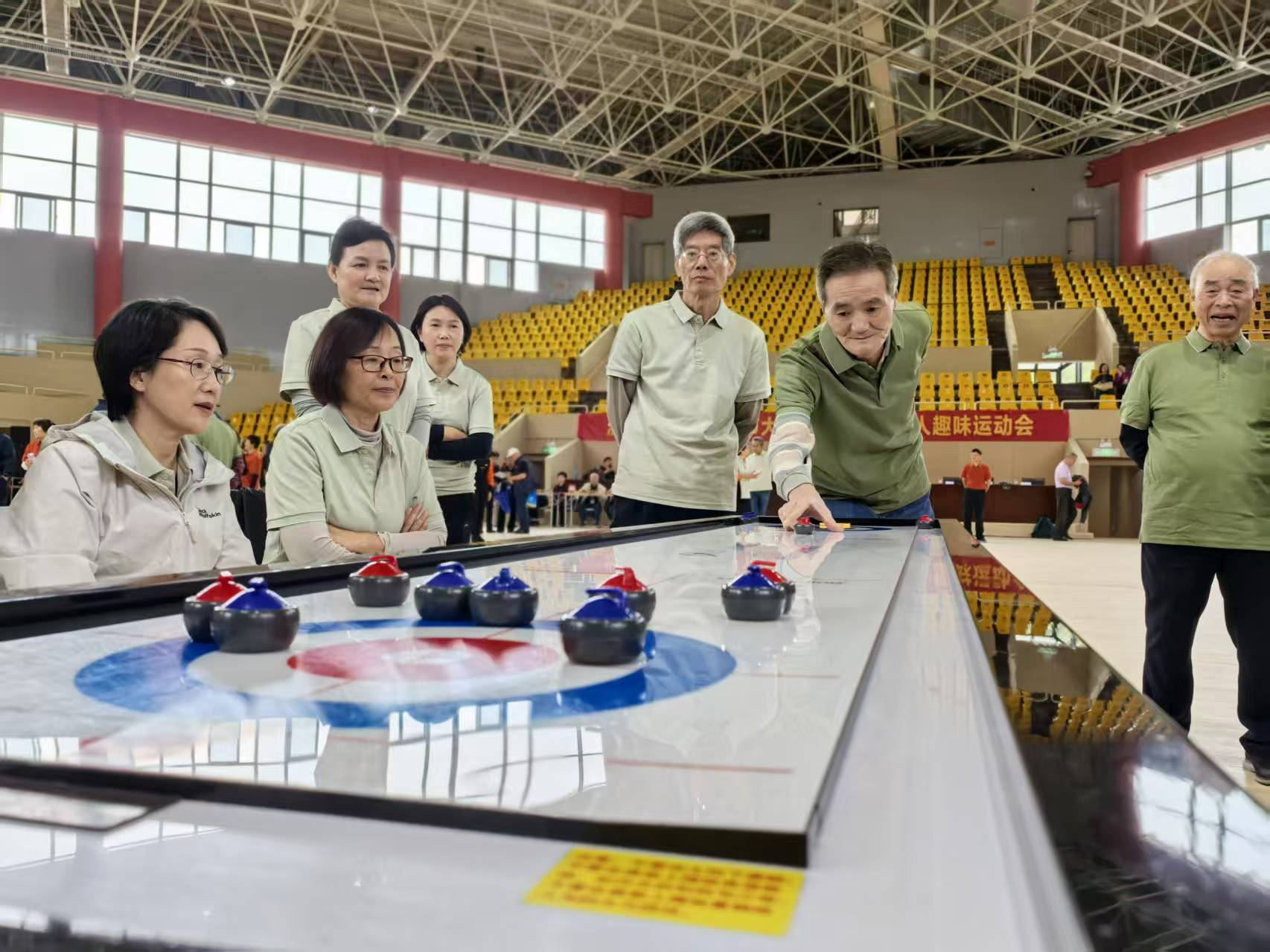 集体项目更是将运动会的氛围推向了高潮。桌上冰壶比赛中,队员们相互配合进行一场智慧与技巧的较量,精心谋划每一次投掷的力度和角度;兜球项目里,队员们弓步瞄准、抖腕抛球,得分时齐声欢呼,共享胜利喜悦。发挥失误时耳边传来阵阵加油声,温暖又有力;托球接力跑的队员们快速地奔跑在赛道上,完成每一次交接,他们的专注和拼搏精神感染了在场的每一个人。