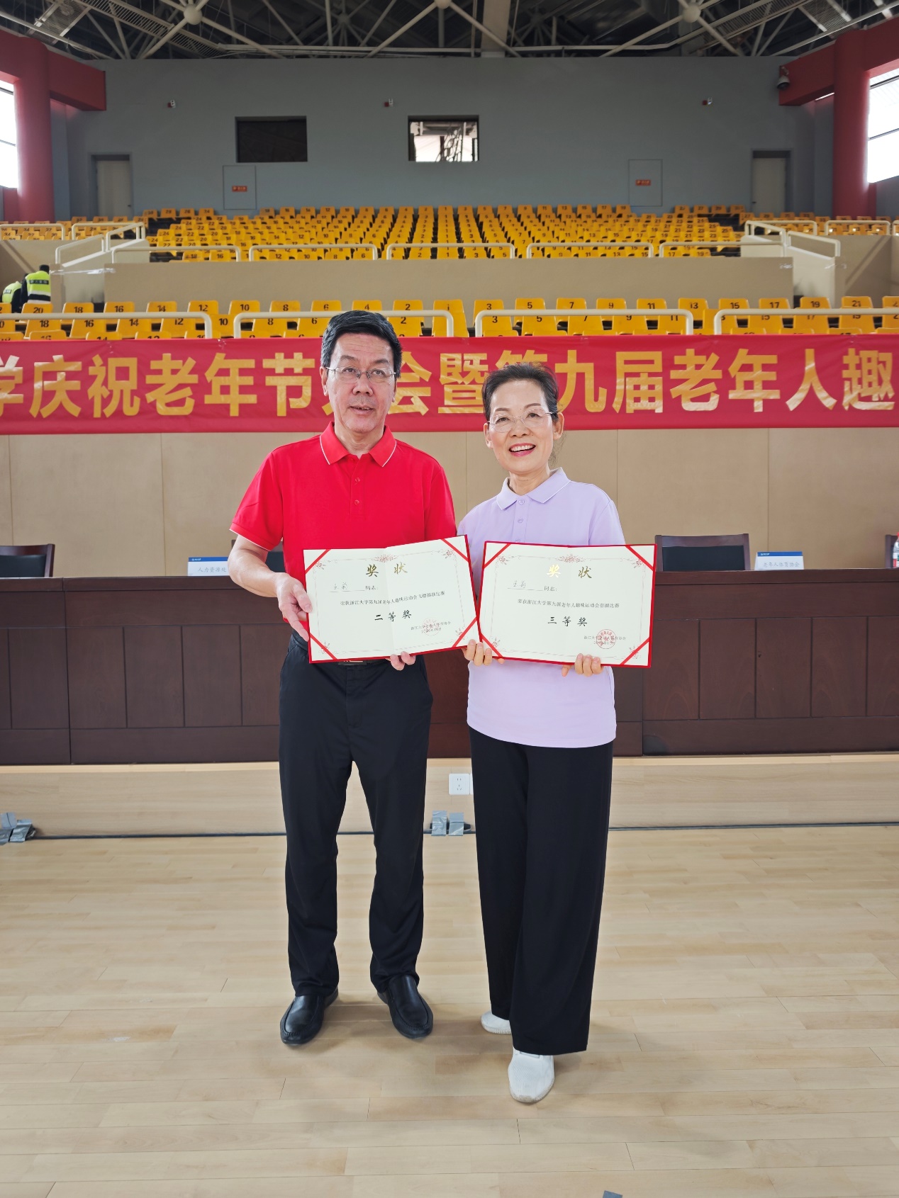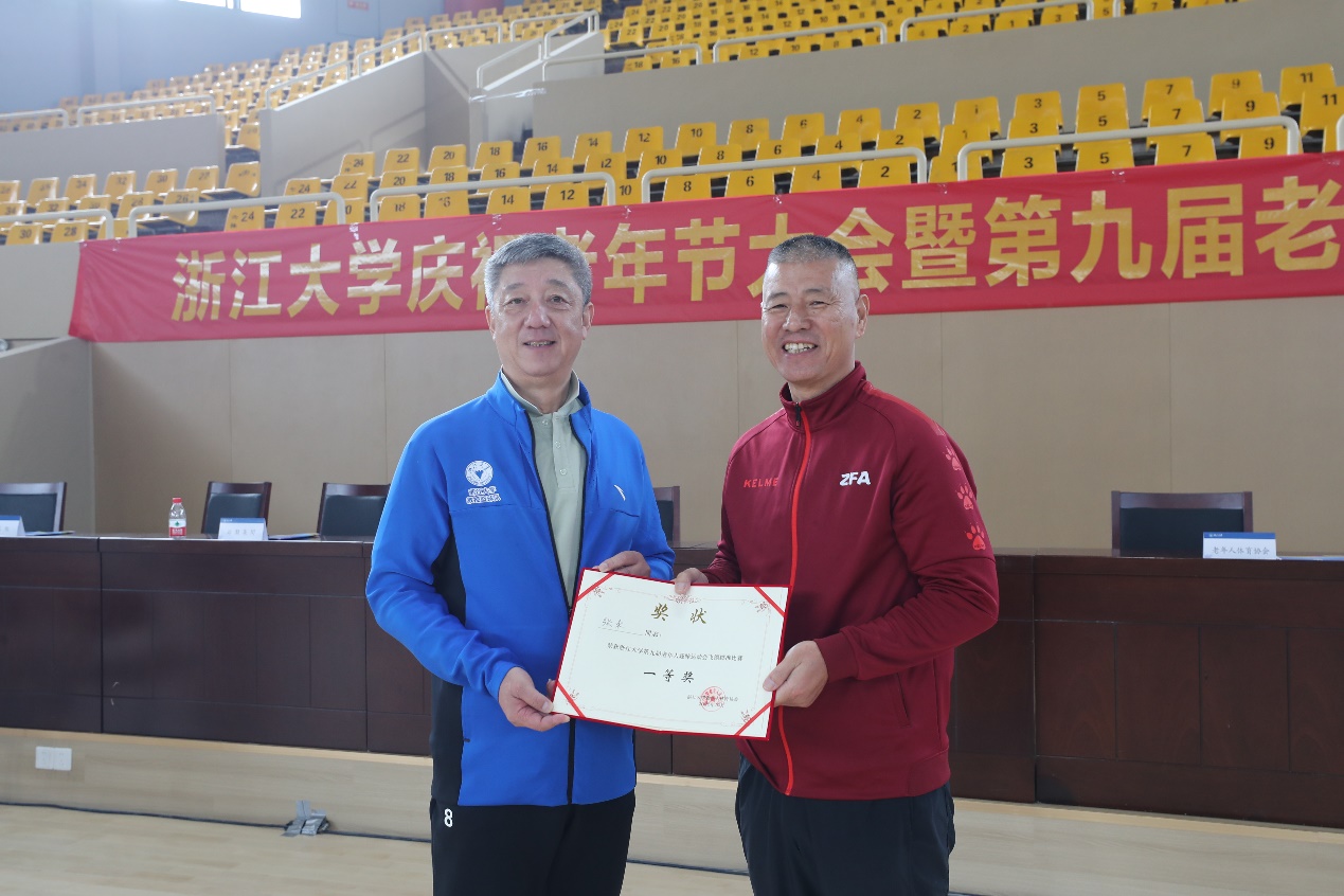 浙江大学党委副书记傅强和老年体协主席胡征宇为先进个人颁奖