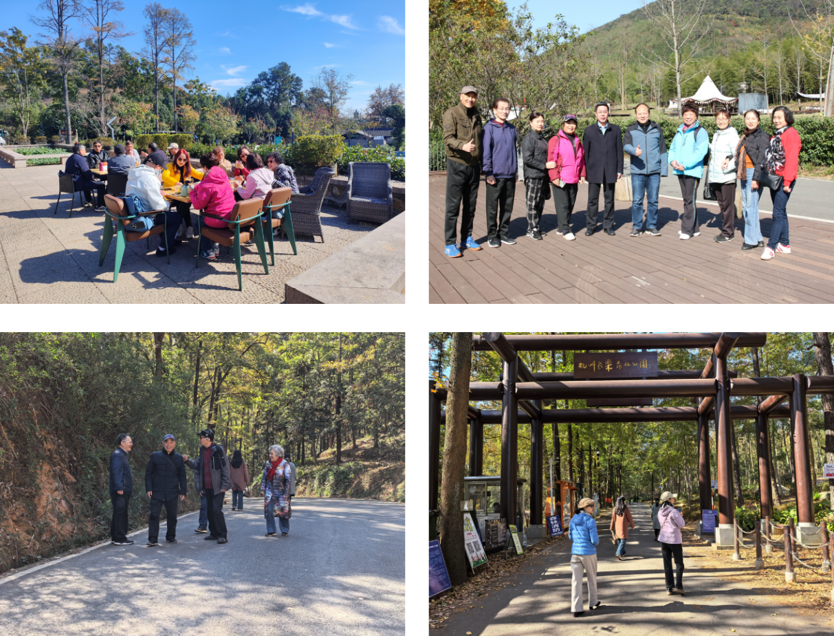 上午,大巴车缓缓驶入林场,老同志们精神矍铄,步履轻健,沿着林间步道拾级而上。天公作美,暖阳透过枝叶洒下斑驳光影,微风轻拂,带来林间特有的清新气息。穿行于金黄与赭红交织的秋色中,老同志们时而驻足留影,记录美好瞬间;行至甘岭水库,波光粼粼的水面倒映层林尽染的山丘,更显其中人影摇曳。