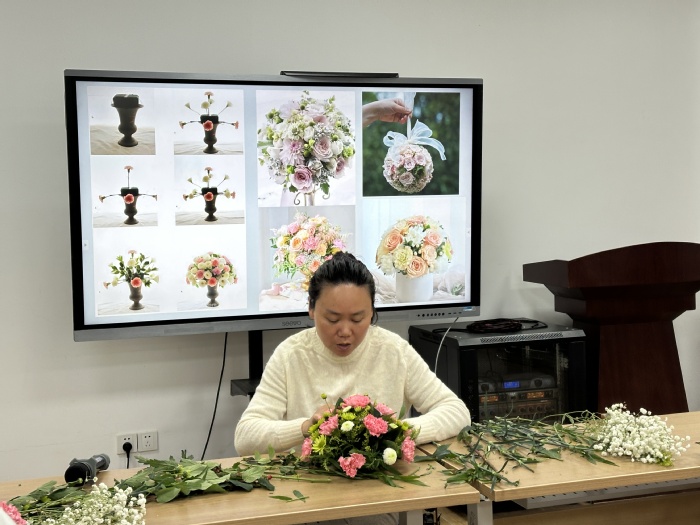 张老师围绕花材选择、色彩搭配、造型设计等内容展开教学,从修剪枝叶的基础技巧到错落有致的构图要点,细致讲解并示范操作。