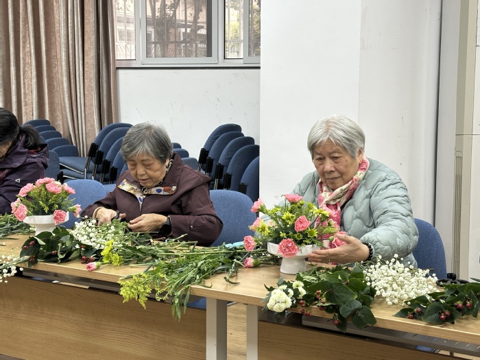 “插花课真是太好了!现在学会了插花的搭配技巧和方法。以后,我们可以把家里的散花插到好看的花盆里,把家里装饰得更加漂亮。”参与插花课的学员们开心地说道。
