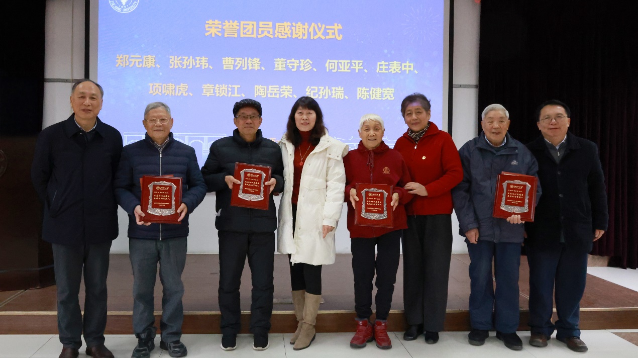 活动分为聘任感谢仪式和迎新联谊两个环节。首先,为因年龄、身体原因不再承担常规性宣讲任务的荣誉团员举行温馨庄重的感谢仪式。朱征宣读感谢信。费英勤、张小玲、沈文华、朱征共同为到场的荣誉团员授荣誉铭牌和感谢信。荣誉铭牌上镌刻着:“不忘初心志凌云 春风化雨育新人”,这正是他们的光辉写照。